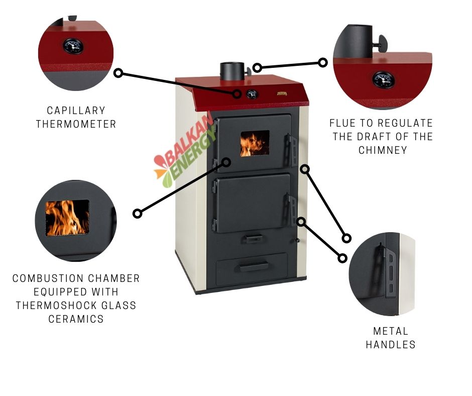 Kedlen er designet til placering i et rum i stueetagen eller en kælder, hvor det er nemt at påfylde træ og træbriketter.